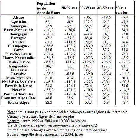 Taux annuel de migration nette 1999-2004, selon l'Age La région Ile-de-France. est la région la plus fortement déficitaire, alors qu'elle présente le plus fort taux excédentaire dans la tranche d'âge des 20-29 ans. L'exode pour la population totale âgée de 5 ans ou plus est moins massif en Bourgogne qu'en Ile-de-France. L'arrivée de migrants est moins élevée en Aquitaine qu'en Midi-Pyrénées. Parmi les onze régions globalement déficitaires, seules I'Ile-de-France et ]'Alsace se distinguent par un solde excédentaire pour les personnes âgée de 20-29 ans et un déficit pour tous les autres âges. Aucune des solutions proposées n'est bonne Toutes les solutions proposées sont bonnes